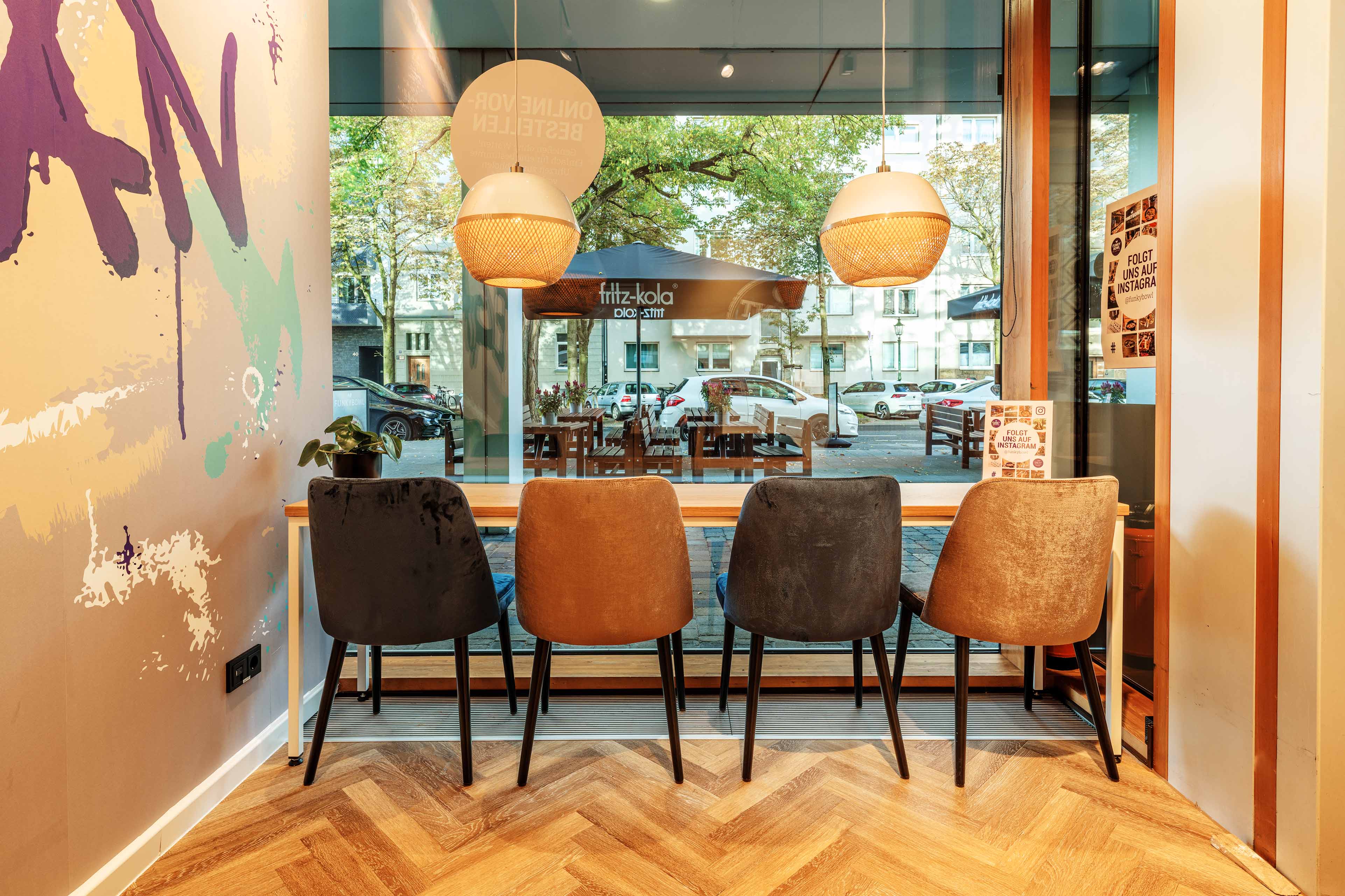 Funkybowl definiert sich als wegweisendes Franchise-Unternehmen im Bereich veganer Systemgastronomie, das besonderen Wert auf die Symbiose von Ladenbau und Markenimage legt. Jede Filiale ist sorgfältig darauf ausgerichtet, den einzigartigen Charme des Standorts nahtlos mit dem innovativen Design von Funkybowl zu verschmelzen. Ein herausragendes Beispiel ist die Düsseldorfer Filiale am Medienhafen, die mit einer umlaufenden, deckenhohen Glasfront beeindruckt. Diese hebt die Theke als zentrales Element hervor, gewährt den Gästen einen faszinierenden Einblick in die Produktpräsentation. Das moderne Design und das natürliche Farbkonzept bilden eine harmonische Kulisse, die jede individuell gestaltete Bowl perfekt zur Geltung bringt. Der Einsatz von Holz und Pflanzen verstärkt den gesunden, nachhaltigen und veganen Spirit von Funkybowl.
