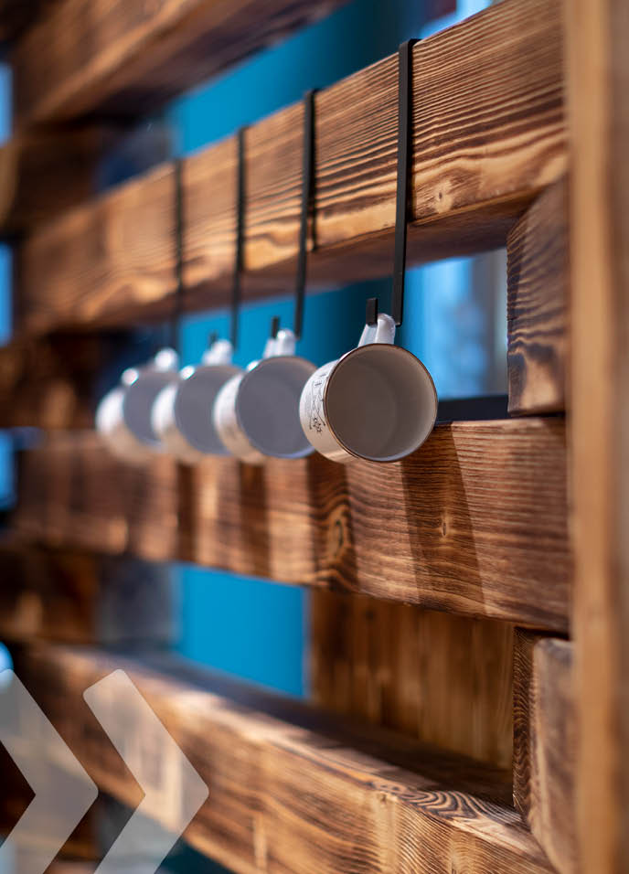Für Globetrotter setzt ARNO das einzigartige Konzept einer Clubhütte um. Optisch erinnert der Bereich an eine rustikale Blockhütte. Die Balken aus in Handarbeit geflammtem Fichtenholz vermitteln ein Gefühl von Natürlichkeit und Outdoor-Erlebnis gleichermaßen. Die Clubhütte, die als Rückzugsort in der Filiale dient, lässt sich schnell und einfach durch
