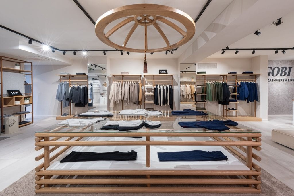 Diese Markenverbundenheit zum mongolischen Lebensstil, sollte auch in der Filiale spürbar werden. Daher haben wir einige wichtige Pfeiler dieser Kultur modern interpretiert und in den Raum übertragen. Beim Betreten der Filiale fällt sofort der große Tisch auf, der mit den dicken runden Hölzern an die Einzäunung der Ziegen erinnert. Das als Tisch und Warenträger stilisierte Gehege der Kaschmirziege, vermittelt die große Bedeutung der nachhaltigen Tierhaltung und Bewirtschaftung der Region.