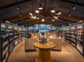 Koenig wandelte die historische Lagerhalle des schleswig-holsteinischen Unternehmens in eine moderne Getränkewelt um. Durch die Eingliederung des Backstores in den ehemaligen Frontstore konnte die Verkaufsfläche verzehnfacht werden. Beeindruckend ist die erzielte Raumwirkung mit der durchgehenden Glasfront im Eingangsbereich und dem gegenüberliegenden großen Rundtor. Die klare, weitgehend symmetrisch gegliederte Ladeneinrichtung setzt das Warenangebot effektvoll in Szene. Indirekte Beleuchtung und warme Lichttöne schaffen den idealen Rahmen für Kundenberatung in Wohlfühlatmosphäre, auf die bei Tadsen viel Wert gelegt wird.